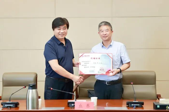 捐贈儀式上,后勤服務(wù)集團(tuán)負(fù)責(zé)人代表學(xué)校接受江蘇乾寶生物科技有限公司的捐贈,宋長春向江蘇乾寶生物科技有限公司發(fā)放捐贈證書。
