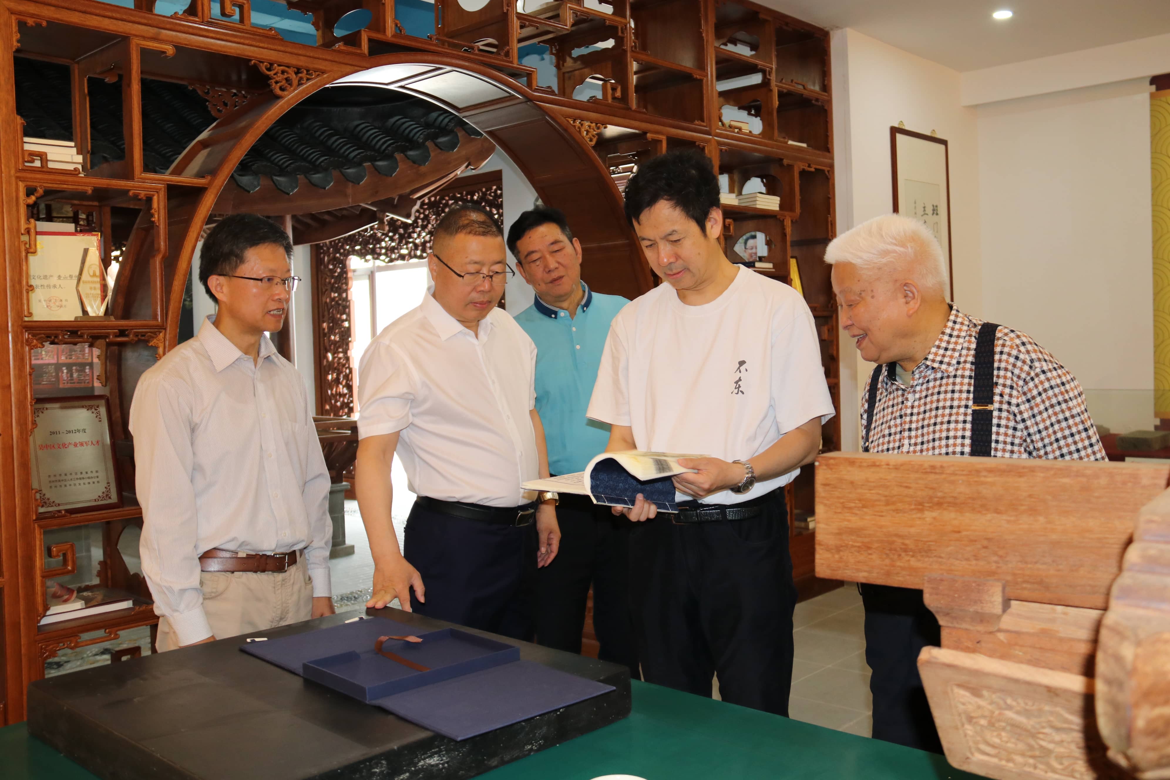 在書院領(lǐng)導(dǎo)的陪同下,吳國(guó)盛教授參觀了太湖書院文博館、名家藏書館、非遺古建館、允中藝術(shù)館、易園和正在設(shè)計(jì)規(guī)劃的現(xiàn)代易學(xué)館場(chǎng)地,實(shí)地考察了書院場(chǎng)館的整體設(shè)計(jì)和現(xiàn)代易學(xué)場(chǎng)館的內(nèi)部結(jié)構(gòu)。