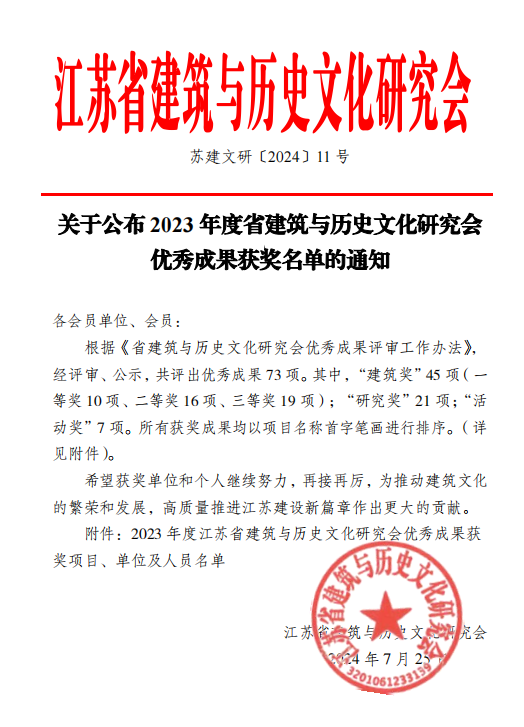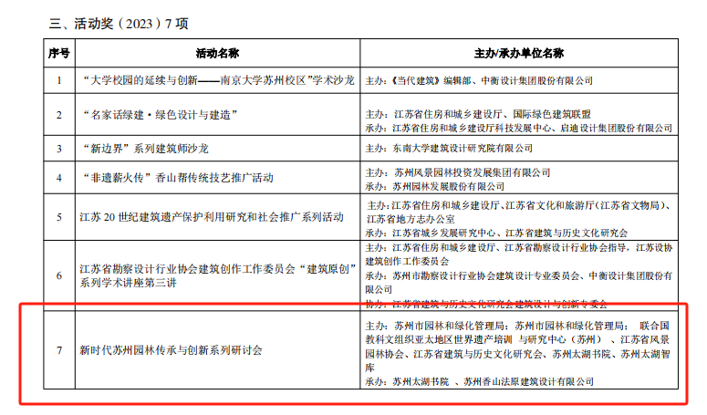 2024年7月25日,省建筑與歷史文化研究會(huì)公布了2023年度省建筑與歷史文化研究會(huì)優(yōu)秀成果獲獎(jiǎng)名單。經(jīng)評(píng)審、公示,共評(píng)出優(yōu)秀成果 73 項(xiàng)。其中,“建筑獎(jiǎng)”45 項(xiàng)(一等獎(jiǎng) 10 項(xiàng)、二等獎(jiǎng) 16 項(xiàng)、三等獎(jiǎng) 19 項(xiàng));“研究獎(jiǎng)”21 項(xiàng);“活動(dòng)獎(jiǎng)”7 項(xiàng)。其中,蘇州太湖書(shū)院、蘇州太湖智庫(kù)榜上有名。