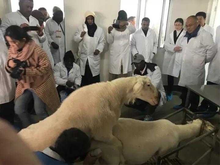學(xué)員在參觀學(xué)習(xí)技術(shù)人員對湖羊人工采精