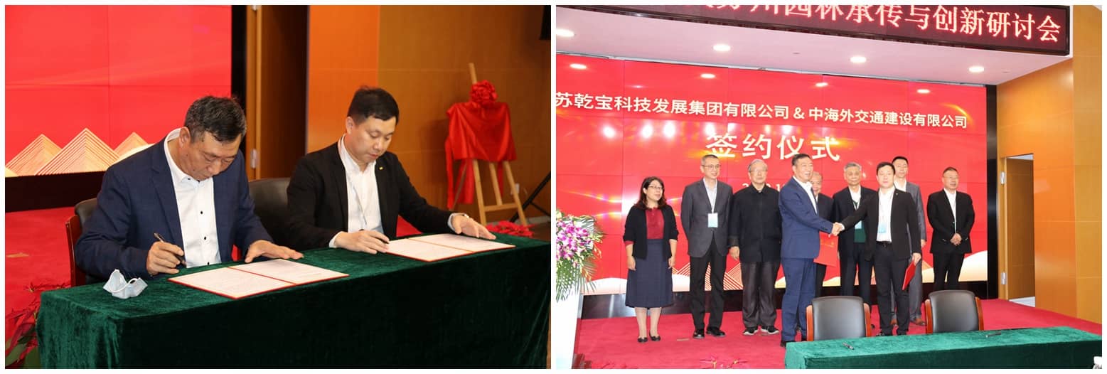 為切實(shí)推進(jìn)新時(shí)代蘇州園林的創(chuàng)新實(shí)踐,促進(jìn)園林產(chǎn)業(yè)走向世界,開幕式上由中海外交通建設(shè)有限公司和江蘇乾寶科技發(fā)展集團(tuán)有限公司共同簽訂了“園林產(chǎn)業(yè)‘一帶一路戰(zhàn)略合作協(xié)議”。