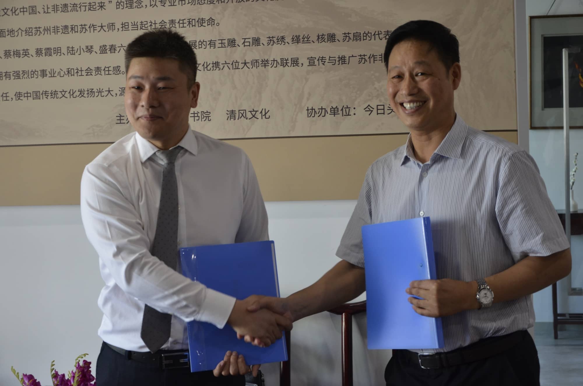?????? 2017年9月18日上午10點(diǎn),太湖書(shū)院攜手清風(fēng)文化舉辦了非遺精品展覽,拉開(kāi)了太湖·清風(fēng)與眾多非遺大師合作的序幕。江蘇乾寶投資集團(tuán)副董事長(zhǎng)朱波主持了揭幕儀式。參加此次非遺精品展的大師有蔡云娣,蔡梅英,蔡霞明,陸小琴,盛春,孫永等。嘉賓有江蘇乾寶投資集團(tuán)董事長(zhǎng)王躍程,陜西清風(fēng)文化產(chǎn)權(quán)交流服務(wù)有限公司總經(jīng)理李寶庫(kù),太湖書(shū)院執(zhí)行院長(zhǎng)沈陽(yáng),江蘇乾寶投資集團(tuán)執(zhí)行總裁王翼寧、常務(wù)總裁王榮華,今日頭條、蘇州區(qū)房產(chǎn)運(yùn)營(yíng)總經(jīng)理張會(huì)來(lái),江蘇乾寶投資集團(tuán)副總裁徐正強(qiáng),太湖書(shū)院副院長(zhǎng)丘東,陜西清風(fēng)文化產(chǎn)權(quán)交流服務(wù)有限公司、清風(fēng)非遺博物館館長(zhǎng)任元鴻,蘇州大學(xué)教授費(fèi)湘軍,陜西清風(fēng)文化產(chǎn)權(quán)交流服務(wù)有限公司產(chǎn)品總監(jiān)陸洋,陜西清風(fēng)文化產(chǎn)權(quán)交流服務(wù)有限公司市場(chǎng)總監(jiān)黃蕊卿,西安大唐古玩市場(chǎng)總經(jīng)理唐亮等出席了展覽活動(dòng)。太湖書(shū)院執(zhí)行院長(zhǎng)沈陽(yáng)、清風(fēng)文化非遺博物館館長(zhǎng)任元鴻、非遺傳承人代表蔡梅英老師先后發(fā)表熱情洋溢的致辭,都希望通過(guò)此次活動(dòng)弘揚(yáng)主族律,傳播正維量,齊心協(xié)力把中國(guó)傳統(tǒng)文化發(fā)揚(yáng)光大。儀式上,大師們?yōu)樘?shū)院·清風(fēng)文化非遺傳承保護(hù)合作基地揭牌,共同見(jiàn)證了乾寶文化與清風(fēng)文化戰(zhàn)略合作的簽約儀式,活動(dòng)取得了圓滿(mǎn)成功。